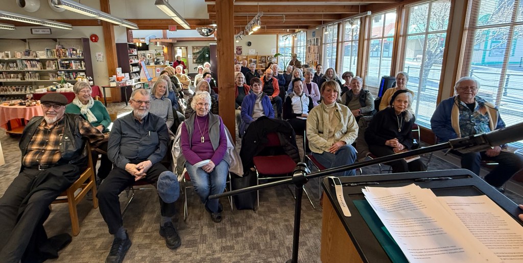 Reading from Across a Narrow Strait at a Royal City Literary Arts Society event with poets Cynthia Sharp and Alan Hill.